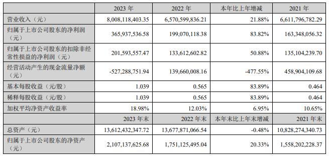 高新发展2023年年度报告显示,2023年,高新发展实现营业收入80.08亿元,同比增长21.88%;归属于上市公司股东的净利润3.66亿元,同比增长83.82%;归属于上市公司股东的扣除非经常性损益的净利润2.02亿元,同比增长50.88%;经营活动产生的现金流量净额-5.27亿元。