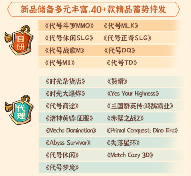 目前,公司已储备包括《代号斗罗MMO》《代号DQ》《时光杂货店》《赘婿》《Mecha Domination》等在内超过40款自研或代理手游,覆盖多元化品类与题材,计划陆续推向市场,将为业务发展注入新动力。