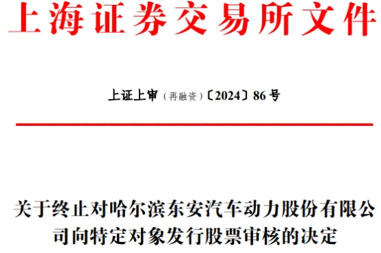 2024年4月19日,东安动力收到上交所《关于终止对哈尔滨东安汽车动力股份有限公司向特定对象发行股票审核的决定》(上证上审(再融资)〔2024〕86号)。上交所根据《上海证券交易所上市公司证券发行上市审核规则》第十九条、《上海证券交易所股票发行上市审核规则》第六十三条(二)的有关规定,决定终止对公司向特定对象发行股票的审核。