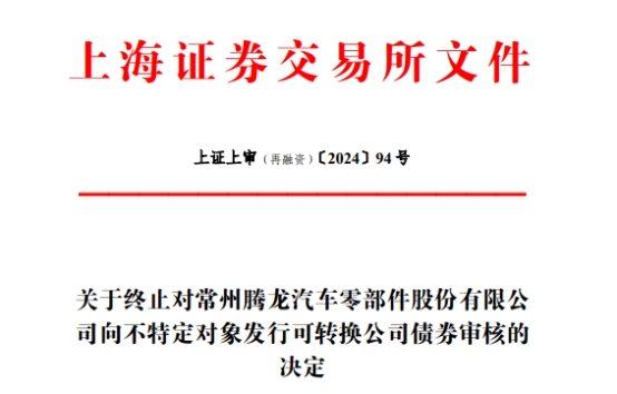 上交所于2023年4月28日依法受理了腾龙股份向不特定对象发行可转换公司债券的申请文件,并按照规定进行了审核。2024年4月19日,腾龙股份和保荐人申万宏源证券承销保荐有限责任公司向上交所提交了《常州腾龙汽车零部件股份有限公司关于撤回向不特定对象发行可转换公司债券申请文件的申请》和《申万宏源证券承销保荐有限责任公司关于撤回常州腾龙汽车零部件股份有限公司向不特定对象发行可转换公司债券申请文件的申请》,分别申请撤回申请文件和申请撤销保荐工作。根据《上海证券交易所上市公司证券发行上市审核规则》第十九条、《上海证券交易所股票发行上市审核规则》第六十三条(二)的有关规定,上交所决定终止对腾龙股份向不特定对象发行可转换公司债券的审核。