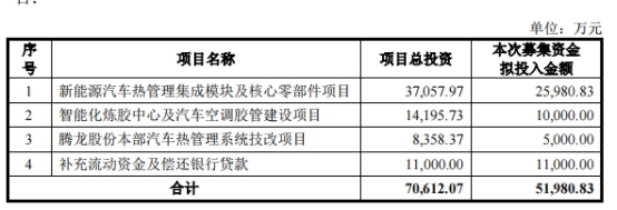 腾龙股份2023年11月28日披露的向不特定对象发行可转换公司债券募集说明书(上会稿)显示,公司本次发行的可转债募集资金总额不超过51,980.83万元(含),扣除发行费用后的募集资金拟用于以下项目:新能源汽车热管理集成模块及核心零部件项目、智能化炼胶中心及汽车空调胶管建设项目、腾龙股份本部汽车热管理系统技改项目、补充流动资金及偿还银行贷款。