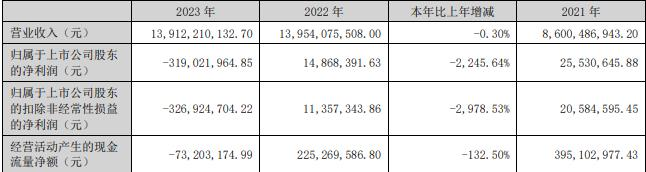据三木集团2023年年报,报告期内,公司实现营业收入139.12亿元,同比减少0.30%;归属于上市公司股东的净利润-3.19亿元,同比减少2245.64%;归属于上市公司股东的扣除非经常性损益的净利润-3.27亿元,同比减少2978.53%;经营活动产生的现金流量净额-7320.32万元,同比减少132.50%。