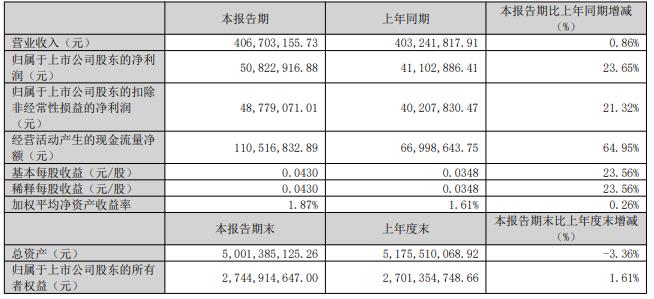 华仁药业2024年第一季度报告显示,2024年第一季度,华仁药业实现营业收入4.07亿元,同比增长0.86%;归属于上市公司股东的净利润5082.29万元,同比增长23.65%;归属于上市公司股东的扣除非经常性损益的净利润4877.91万元,同比增长21.32%;经营活动产生的现金流量净额1.11亿元,同比增长64.95%。