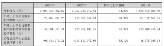 中国经济网北京4月25日讯 苏文电能(300982.SZ)昨晚披露2023年年度报告,公司2023年实现营业收入26.94亿元,同比增长14.30%;归属于上市公司股东的净利润7840.33万元,同比下降69.36%;归属于上市公司股东的扣除非经常性损益后的净利润5400.16万元,同比下降76.34%;经营活动产生的现金流量净额-9834.43万元,同比增长55.12%。