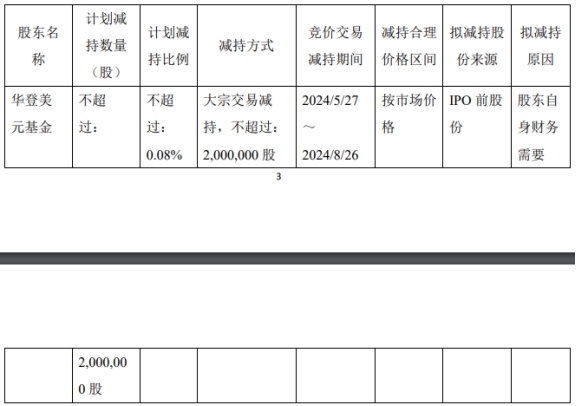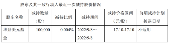 2022年9月8日,华登美元基金因工作人员误操作通过集中竞价方式减持公司股份合计100,000股,金额为人民币171.00万元。减持后,华登美元基金合计持有公司股份126,721,550股,占公司当时总股本的比例为5.071%。上述行为不符合《上海证券交易所上市公司股东及董事、监事、高级管理人员减持股份实施细则》第十三条“大股东、董监高通过集中竞价交易减持股份的,应当在首次卖出股份的15个交易日前向本所报告备案减持计划,并予以公告”的规定。除上述减持情形外,华登美元基金未进行任何其他减持操作。