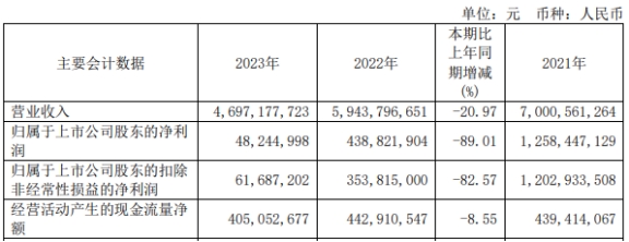 2023年,格科微实现营业收入46.97亿元,同比减少20.97%;实现归属于上市公司股东的净利润4824.50万元,同比减少89.01%;实现归属于上市公司股东的扣除非经常性损益的净利润6168.72万元,同比减少82.57%;经营活动产生的现金流量净额为4.05亿元,同比下降8.55%。
