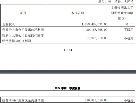 2024年第一季度,格科微实现营业收入12.89亿元,同比增长51.13%;实现归属于上市公司股东的净利润3016.34万元;实现归属于上市公司股东的扣除非经常性损益的净利润1197.39万元;经营活动产生的现金流量净额为-3.71亿元。