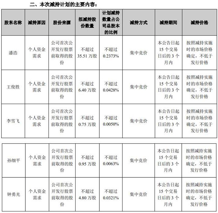 持有公司股份3.80万股(占公司总股本比例0.0254%)的监事孙细平计划自公告日起15个交易日后的3个月内通过集中竞价交易方式减持公司股份不超过0.95万股,减持比例合计不超过公司目前总股本比例的0.0063%。