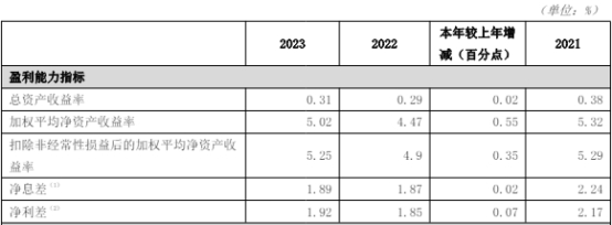 2023年,吉林银行的加权平均净资产收益率为5.02%,较上年增长0.55个百分点;扣除非经常性损益后的加权平均净资产收益率为5.25%,较上年增长0.35个百分点。