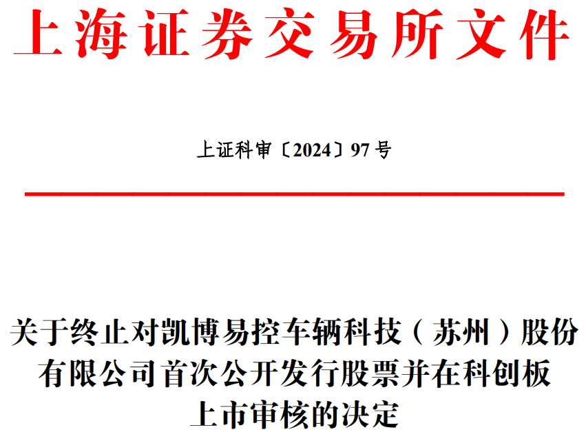 中国经济网北京5月7日讯 上交所网站昨日发布关于终止对凯博易控车辆科技(苏州)股份有限公司(简称“凯博易控”)首次公开发行股票并在科创板上市审核的决定。