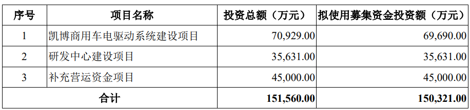 凯博易控原拟募集资金150,321.00万元,用于凯博商用车电驱动系统建设项目、研发中心建设项目、补充营运资金项目。