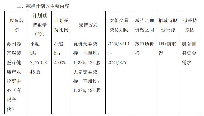 中国经济网北京5月7日讯 嘉和美康(688246.SH)昨晚发布股东减持股份计划公告。嘉和美康于2024年5月6日收到苏州赛富璞鑫医疗健康产业投资中心(有限合伙)(以下简称“赛富璞鑫”)出具的《关于股东减持计划的告知函》,因自身资金需求,股东赛富璞鑫计划根据市场情况拟通过集中竞价方式和大宗交易方式减持其持有的公司股份合计不超过2,770,846股,即不超过公司总股本的2.00%。其中,通过集中竞价交易方式和大宗交易方式分别减持不超过1,385,423股,自公告披露之日起3个交易日后的90天内进行。