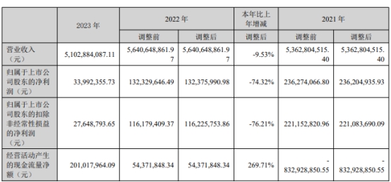 2023年年度报告显示,去年,公司营业收入51.03亿元,同比减少9.53%;归属于上市公司股东的净利润3399.24万元,同比减少74.32%;归属于上市公司股东的扣除非经常性损益的净利润2764.88万元,同比减少76.21%;经营活动产生的现金流量净额2.01亿元,同比增长269.71%。