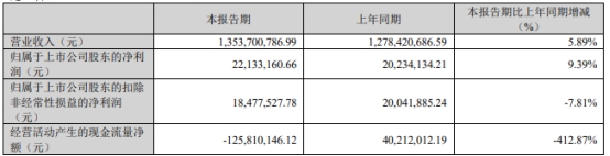 2024年第一季度报告显示,今年一季度,公司营业收入13.54亿元,同比增长5.89%;归属于上市公司股东的净利润2213.32万元,同比增长9.39%;归属于上市公司股东的扣除非经常性损益的净利润1847.75万元,同比减少7.81%;经营活动产生的现金流量净额-1.26亿元,同比减少412.87%。