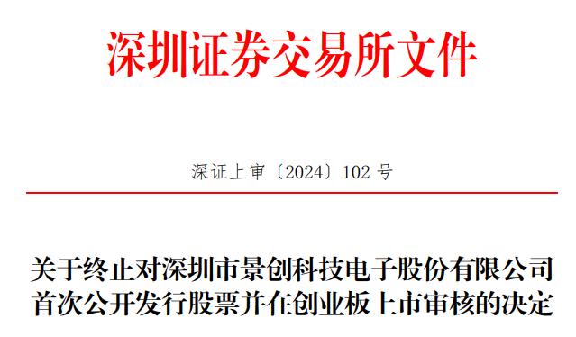日前,景创科技向深交所提交了《深圳市景创科技电子股份有限公司关于撤回首次公开发行股票并在创业板上市申请文件的申请》,保荐人向深交所提交了《中信证券股份有限公司关于撤销保荐深圳市景创科技电子股份有限公司首次公开发行股票并在创业板上市的申请》。根据《深圳证券交易所股票发行上市审核规则》第六十二条的有关规定,深交所决定终止对景创科技首次公开发行股票并在创业板上市的审核。