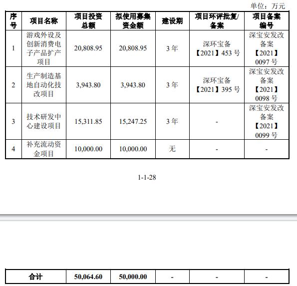 景创科技公开发行新股不超过3,000万股,占本次发行后公司总股本的比例不低于25%,原股东不公开发售老股。景创科技原拟募集资金50,000.00万元,分别用于游戏外设及创新消费电子产品扩产项目、生产制造基地自动化技改项目、技术研发中心建设项目、补充流动资金项目。