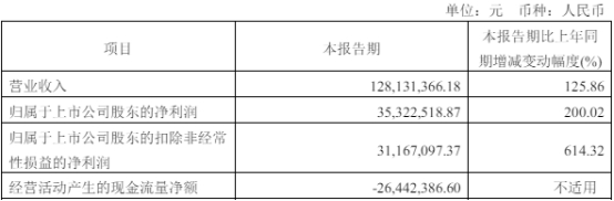 2024年第一季度报告显示,今年第一季度,公司实现营业收入1.28亿元,同比增长125.86%;归属于上市公司股东的净利润3532.25万元,同比增长200.02%;归属于上市公司股东的扣除非经常性损益的净利润3116.71万元,同比增长614.32%;经营活动产生的现金流量净额为-2644.24万元。
