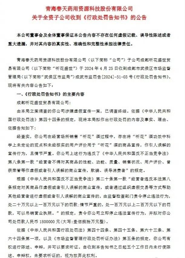 4月26日晚间,听花酒母公司青海春天发布公告称,全资子公司成都听花盛世贸易有限公司(以下简称听花盛世),收到了成都市武侯区市场监督管理局的《行政处罚告知书》(以下简称处罚书)。