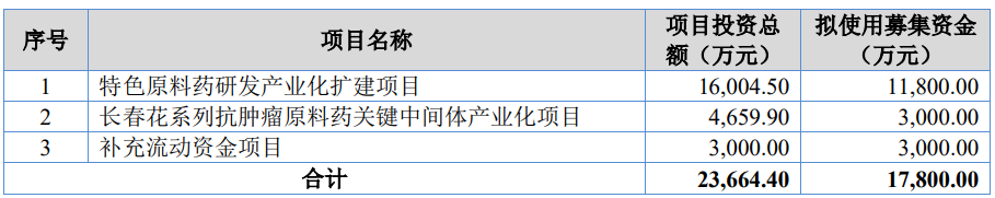 宏中药业原拟募集资金17,800.00万元,用于特色原料药研发产业化扩建项目、长春花系列抗肿瘤原料药关键中间体产业化项目、补充流动资金项目。