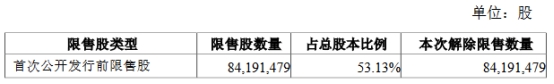本次上市流通的限售股属于首次公开发行前限售股,限售期为自公司首次公开发行并上市之日起12个月,股份数量为84,191,479股,占公司总股本的53.13%,该部分限售股将于2024年5月10日起上市流通。