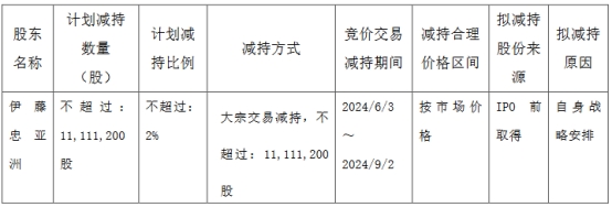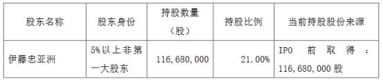 截至公告日,伊藤忠亚洲持有公司无限售条件流通股116,680,000股,占公司总股本21.00%,其所持股份全部来源于公司首次公开发行前持有的股份,并于2022年10月28日起上市流通。