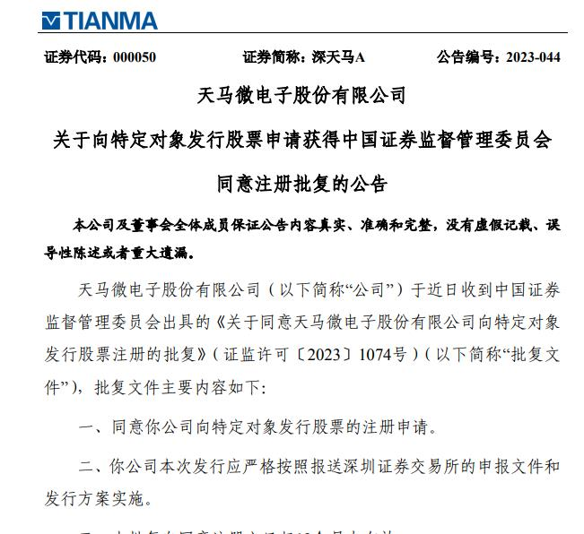 公司于2023年5月19日收到中国证监会出具的批复(证监许可〔2023〕1074号),同意公司向特定对象发行股票的注册申请,批复自同意注册之日(2023年5月12日)起12个月内有效。