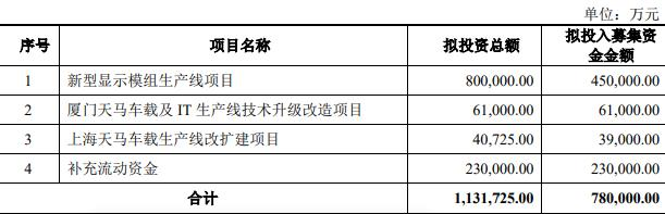 本次向特定对象发行募集资金总额不超过780,000.00万元,扣除发行费用后拟将募集资金全部用于新型显示模组生产线项目、厦门天马车载及IT生产线技术升级改造项目、上海天马车载生产线改扩建项目、补充流动资金。