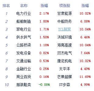 板块方面,燃气、港口航运、电力、小家电、非汽车交运涨幅居前,酒店及餐饮、国防军工、计算机应用、贵金属、其他电子跌幅居前。