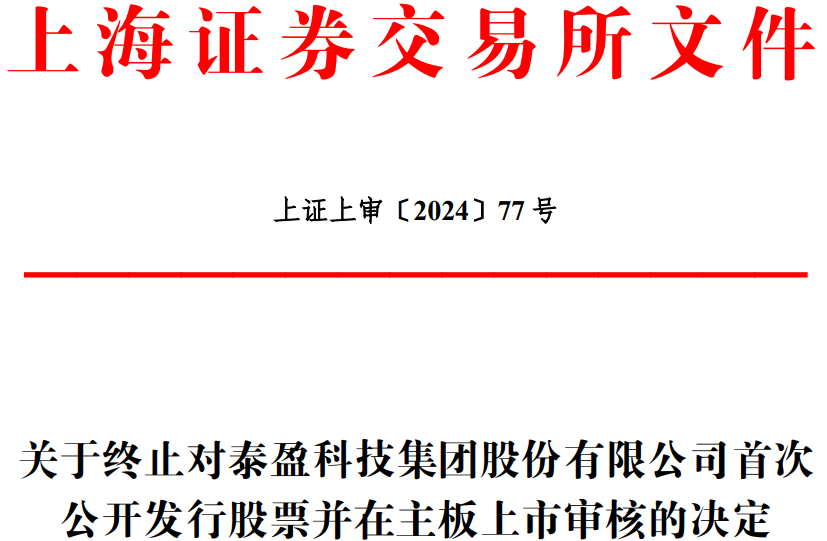 上交所于2023年3月3日依法受理了泰盈科技首次公开发行股票并在主板上市的申请文件,并按照规定进行了审核。日前,泰盈科技和保荐人中国国际金融股份有限公司向上交所提交了《泰盈科技集团股份有限公司关于撤回首次公开发行股票并在主板上市申请文件的申请》和《中国国际金融股份有限公司关于撤回泰盈科技集团股份有限公司首次公开发行股票并在主板上市申请文件的申请》,申请撤回申请文件。根据《上海证券交易所股票发行上市审核规则》第六十三条的有关规定,上交所决定终止对泰盈科技首次公开发行股票并在主板上市的审核。