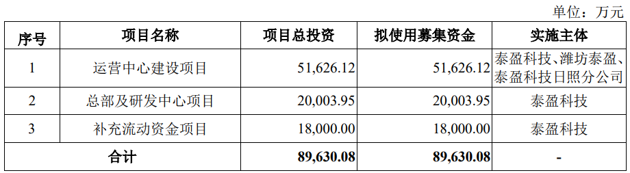 泰盈科技原拟在上交所主板发行股票数量不超过66,496,334股,不低于发行后总股本的25.00%,全部为新股发行,不涉及老股转让。公司拟募集资金89,630.08万元,用于运营中心建设项目、总部及研发中心项目、补充流动资金项目。