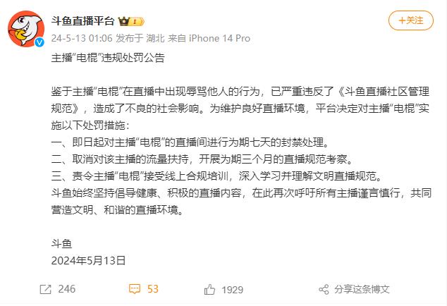 公告称,鉴于主播“电棍”在直播中出现辱骂他人的行为,已严重违反了《斗鱼直播社区管理规范》,造成了不良的社会影响。为维护良好直播环境,平台决定对主播“电棍”实施以下处罚措施: