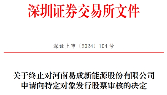 中国经济网北京5月14日讯 深交所网站昨日披露了关于终止对河南易成新能源股份有限公司(简称“易成新能”,300080.SZ)申请向特定对象发行股票审核的决定。
