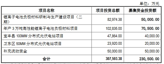 易成新能2023年12月1日披露的《向特定对象发行股票募集说明书(二次修订稿)》显示,公司拟向特定对象发行股票募集资金总额不超过230,500.00万元(含本数),扣除发行费用后的募集资金净额将全部用于锂离子电池负极材料研制与生产建设项目(二期)、年产3万吨高性能锂离子电池负极材料项目、宝丰县100MW分布式光伏电站项目、卫东区50MW分布式光伏电站项目、补充流动资金。