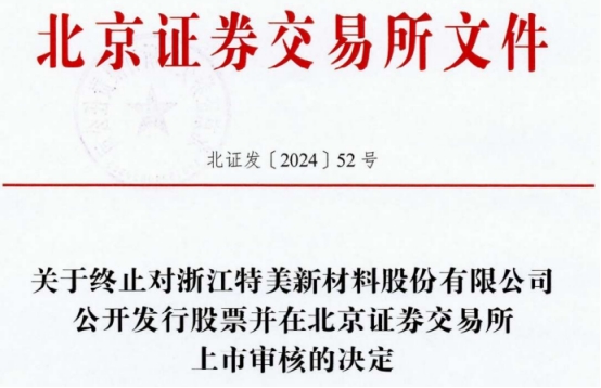 北交所于2023年6月26日受理了特美股份提交的公开发行相关申请文件,并按照规定进行了审核。2024年4月15日,特美股份向北交所提交了《关于浙江特美新材料股份有限公司撤回向不特定合格投资者公开发行股票并在北京证券交易所上市申请文件的申请报告》,申请撤回申请文件。根据《北京证券交易所向不特定合格投资者公开发行股票并上市审核规则》第五十三条的有关规定,北交所决定终止特美股份公开发行股票并在北京证券交易所上市的审核。