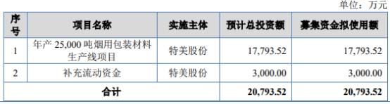 特美股份原拟在北交所发行数量不超过17,870,000股(未考虑超额配售选择权);不超过20,550,500股(全额行使超额配售选择权)。公司原拟募资20,793.52万元,用于“年产25,000吨烟用包装材料生产线项目”和“补充流动资金”。