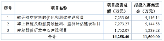 摩尔股份原拟募集资金11,500.00万元,用于“航天航空材料的优化和测试建设项目”“海上设施及船舶腐蚀检测、监测评估建设项目”“摩尔股份研发中心建设项目”。