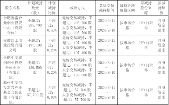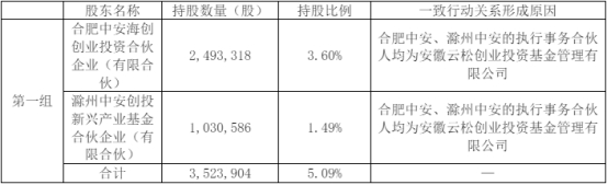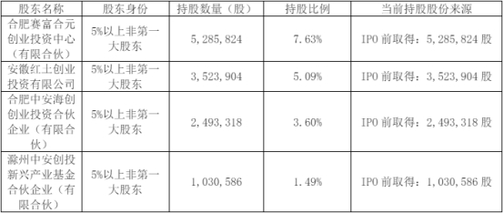 截至公告披露日,公司股东赛富创投持有公司股份5,285,824股,占公司总股本的7.63%;红土创投持有公司股份3,523,904股,占公司总股本的5.09%;合肥中安持有公司股份2,493,318股,占公司总股本的3.60%;滁州中安持有公司股份1,030,586股,占公司总股本的1.49%。合肥中安、滁州中安的执行事务合伙人均为安徽云松创业投资基金管理有限公司,二者构成一致行动人,合计持有公司股份3,523,904股,占公司总股本比例为5.09%。