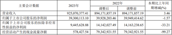 2023年年度报告显示,去年,公司营业收入9.25亿元,同比增长3.46%;归属于上市公司股东的净利润3930.01万元,同比减少1.57%;归属于上市公司股东的扣除非经常性损益的净利润944.56万元,同比减少33.21%;经营活动产生的现金流量净额57.84万元,同比减少99.27%。