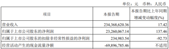 2024年第一季度报告显示,报告期内,公司营业收入2.34亿元,同比增长17.42%;归属于上市公司股东的净利润2326.01万元,同比增长137.46%;归属于上市公司股东的扣除非经常性损益的净利润23.50万元,同比减少92.73%;经营活动产生的现金流量净额-6989.68万元。
