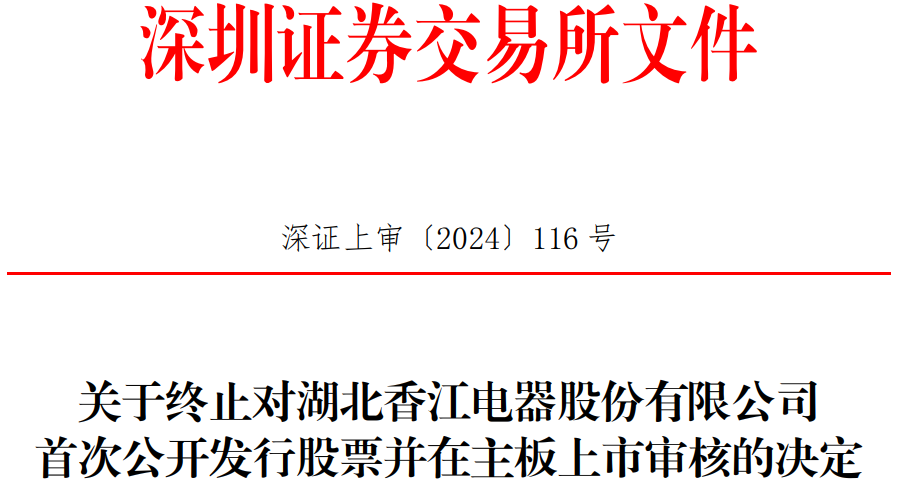 中国经济网北京5月23日讯 深交所网站昨日披露了关于终止对湖北香江电器股份有限公司(简称“香江电器”)首次公开发行股票并在主板上市审核的决定。