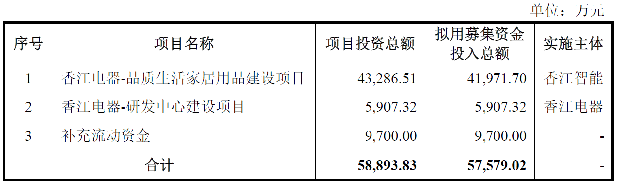 香江电器原拟在深交所主板公开发行不超过6,821.9837万股,占发行后总股本的比例不低于25%,不涉及原有股东公开发售股份的情况。公司拟募集资金57,579.02万元,用于香江电器-品质生活家居用品建设项目、香江电器-研发中心建设项目、补充流动资金。