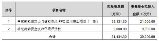 本次发行的募集资金总额不超过30,000万元(含本数),不超过三亿元且不超过最近一年末净资产百分之二十,扣除发行费用后将全部用于中京新能源动力与储能电池FPC应用模组项目(一期)、补充流动资金及归还银行贷款。
