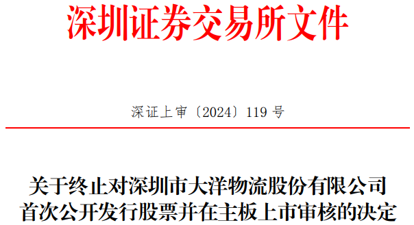 日前,大洋物流向深交所提交了《深圳市大洋物流股份有限公司关于撤回首次公开发行股票并在主板上市申请文件的申请》,保荐人向深交所提交了《长城证券股份有限公司关于撤回深圳市大洋物流股份有限公司首次公开发行股票并在主板上市申请文件的申请》。根据《深圳证券交易所股票发行上市审核规则(2024年修订)》第六十二条的有关规定,深交所决定终止对大洋物流首次公开发行股票并在主板上市的审核。
