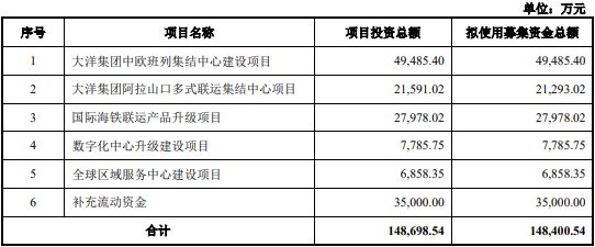 大洋物流原拟在深交所主板公开发行股票不超过3,333.34万股,占发行后总股本的比例不低于25.00%;本次不涉及股东公开发售股份。大洋物流原拟募集资金148,400.54万元,分别用于大洋集团中欧班列集结中心建设项目、大洋集团阿拉山口多式联运集结中心项目、国际海铁联运产品升级项目、数字化中心升级建设项目、全球区域服务中心建设项目和补充流动资金。