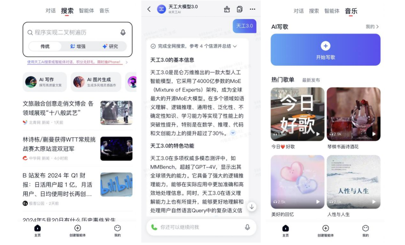 (天工AI搜索、AI对话、AI音乐用户界面)