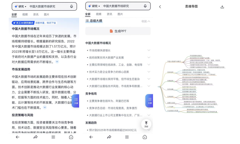 (天工AI搜索研究模式自动生成研究大纲、思维导图等)