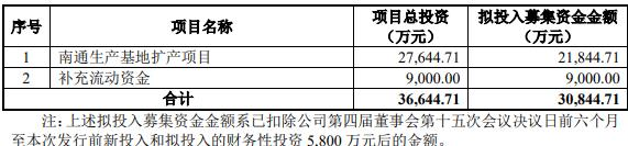 公司昨晚披露《向不特定对象发行可转换公司债券预案》称,本次向不特定对象发行可转换公司债券的募集资金总额不超过30,844.71万元(含),扣除发行费用后的募集资金净额将用于投入南通生产基地扩产项目、补充流动资金。