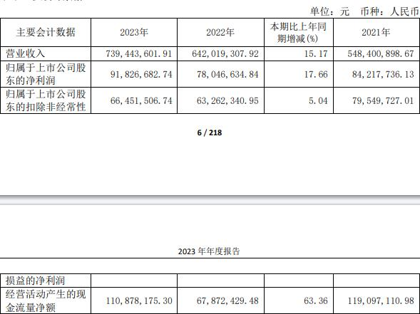 据凯众股份2023年年报,报告期内,公司实现营业收入7.39亿元,同比增长15.17%;归属于上市公司股东的净利润9182.67万元,同比增长17.66%;归属于上市公司股东的扣除非经常性损益的净利润6645.15万元,同比增长5.04%;经营活动产生的现金流量净额1.11亿元,同比增长63.36%。