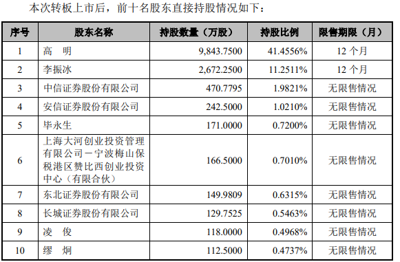 转板上市后,中信证券、安信证券、东北证券、长城证券分别持有观典防务470.7795万股、242.5000万股、149.9809万股、129.7525万股,持股比例分别为1.9821%、1.0210%、0.6315%、0.5463%,均为无限售流通股。
