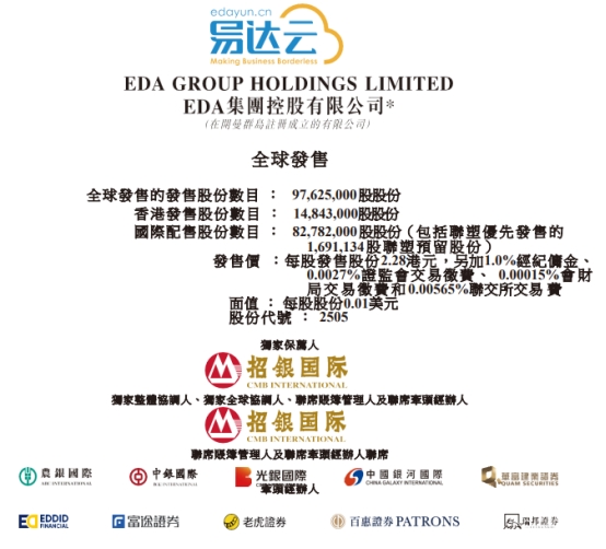 EDA集团控股的独家保荐人为招银国际融资有限公司,独家整体协调人、独家全球协调人、联席账簿管理人及联席牵头经办人为招银国际融资有限公司,联席账簿管理人及联席牵头经办人联席为农银国际融资有限公司、农银国际证券有限公司、中银国际亚洲有限公司、光银国际资本有限公司、中国银河国际证券(香港)有限公司、华富建业证券有限公司、艾德证券期货有限公司、富途证券国际(香港)有限公司、老虎证券(香港)环球有限公司、百惠证券有限公司、瑞邦证券有限公司。